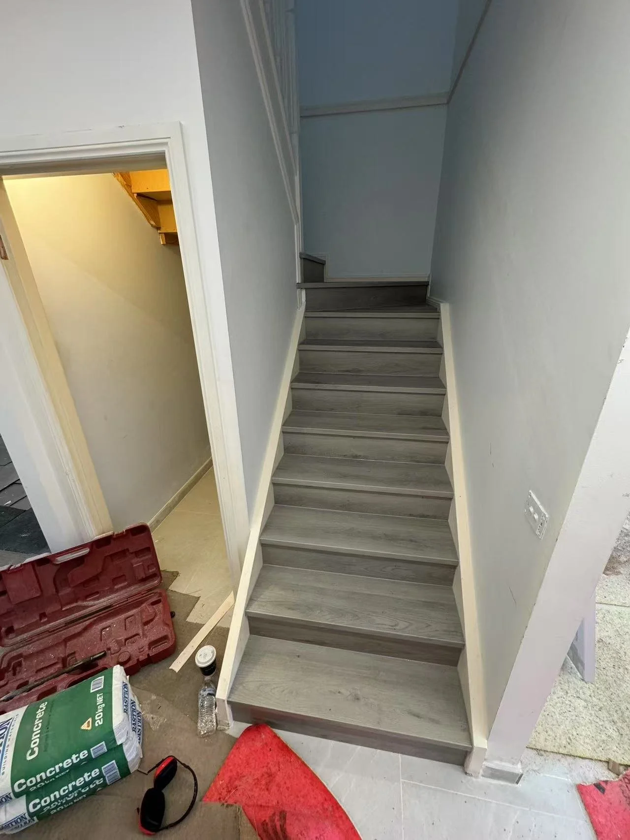 Indoor staircase with gray wood-like steps, white walls, and construction materials nearby.