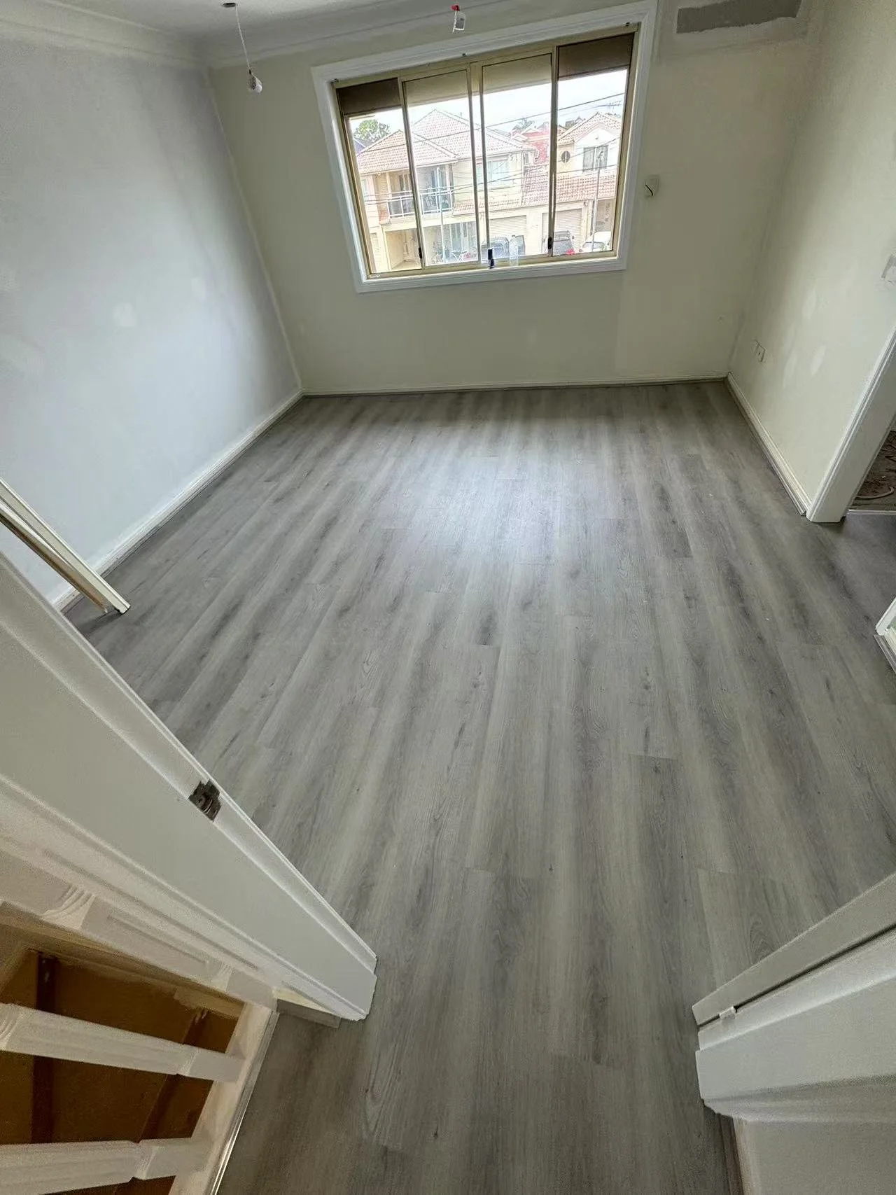Empty room with light gray flooring, white walls, and a large window showing exterior houses.