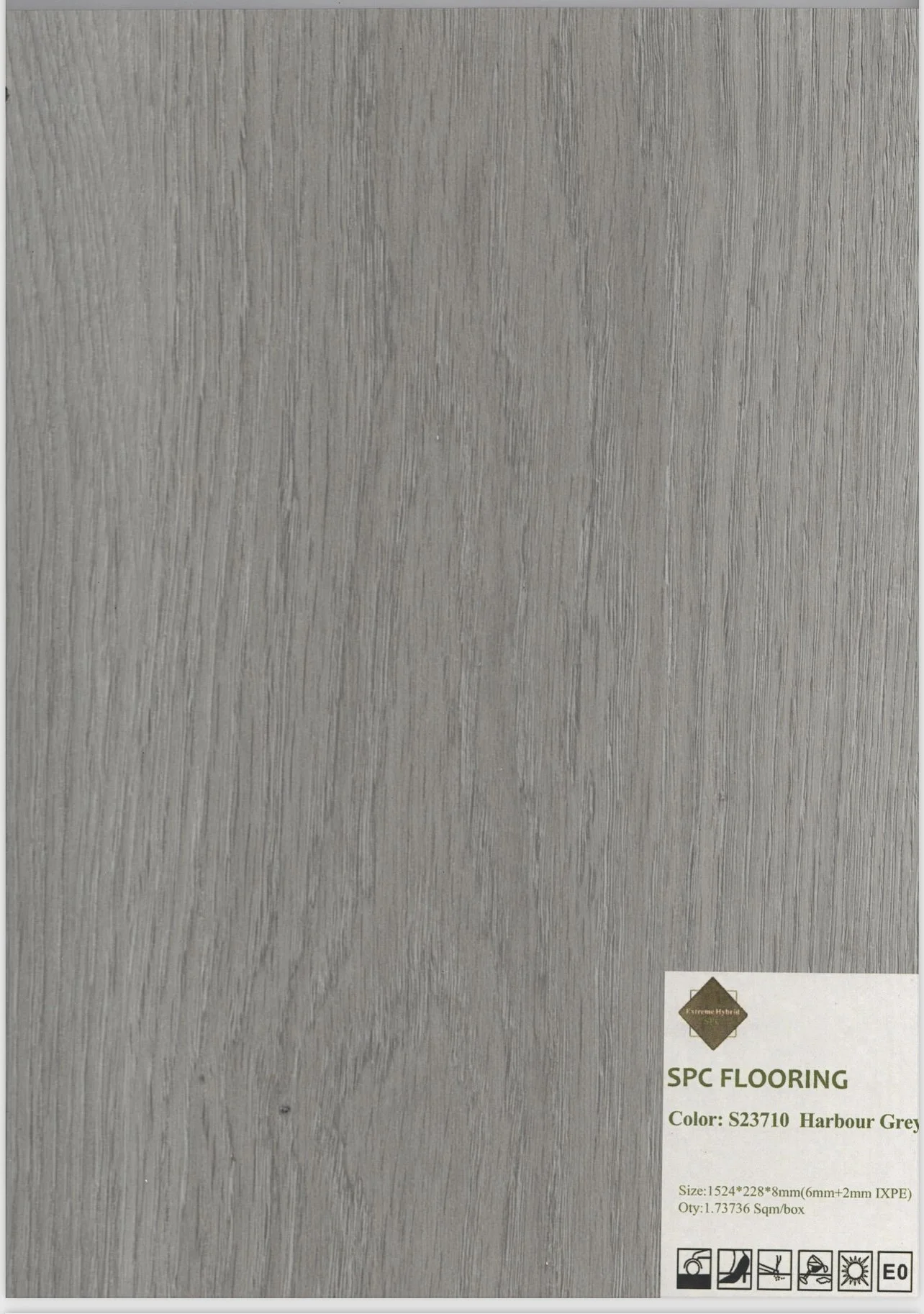 Grey SPC wood flooring sample from Extreme Hybrid collection, labeled Harbour Grey.