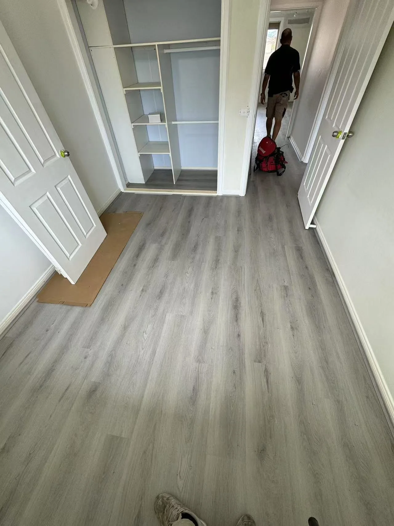 Empty room with light-colored wooden flooring, open closet with shelves, and two open white doors. A person is walking away in the hallway, carrying a red bag.
