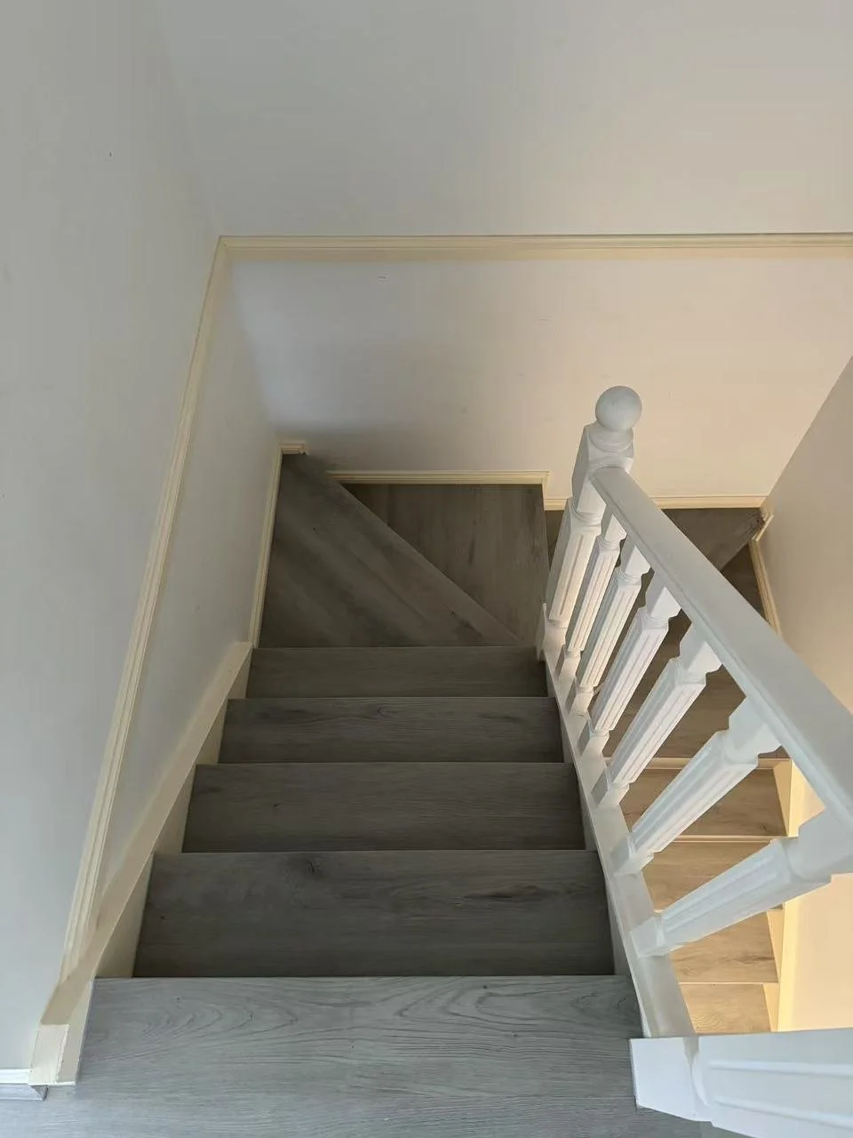 View from the top of a staircase looking down, showing grey wooden steps, white spindled railing, and beige trim on the walls.