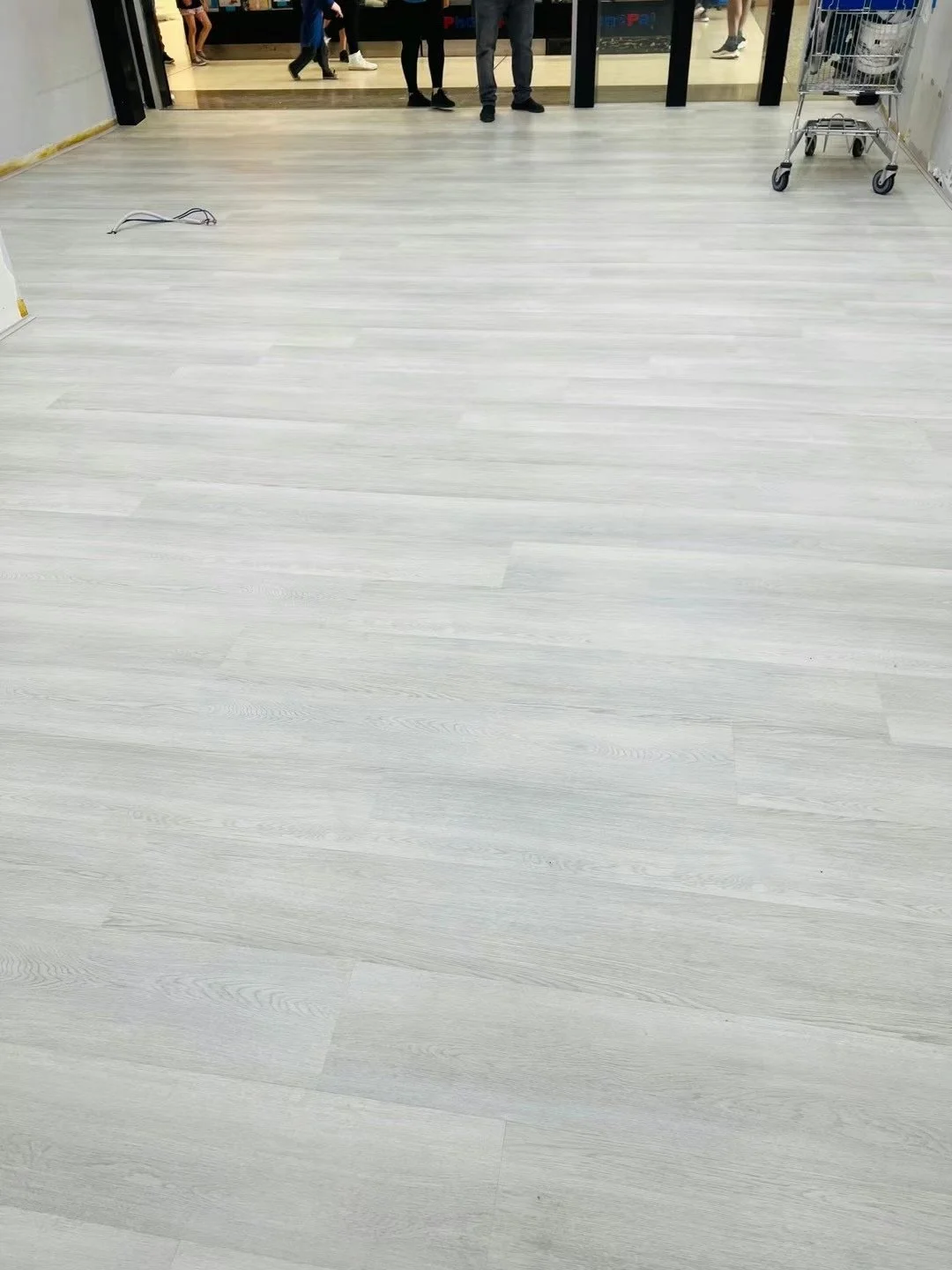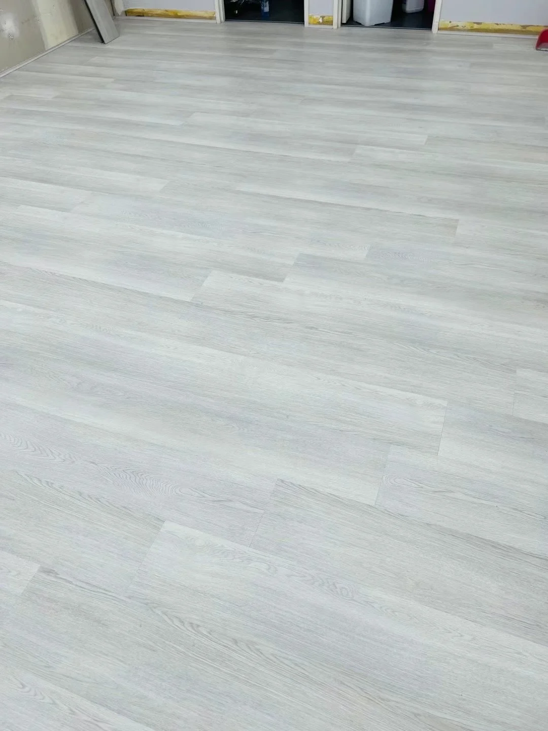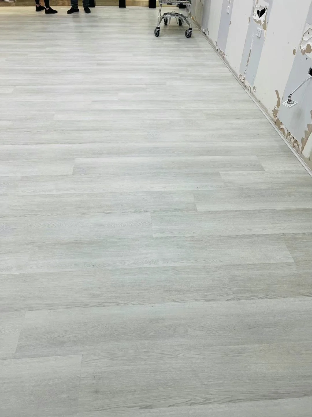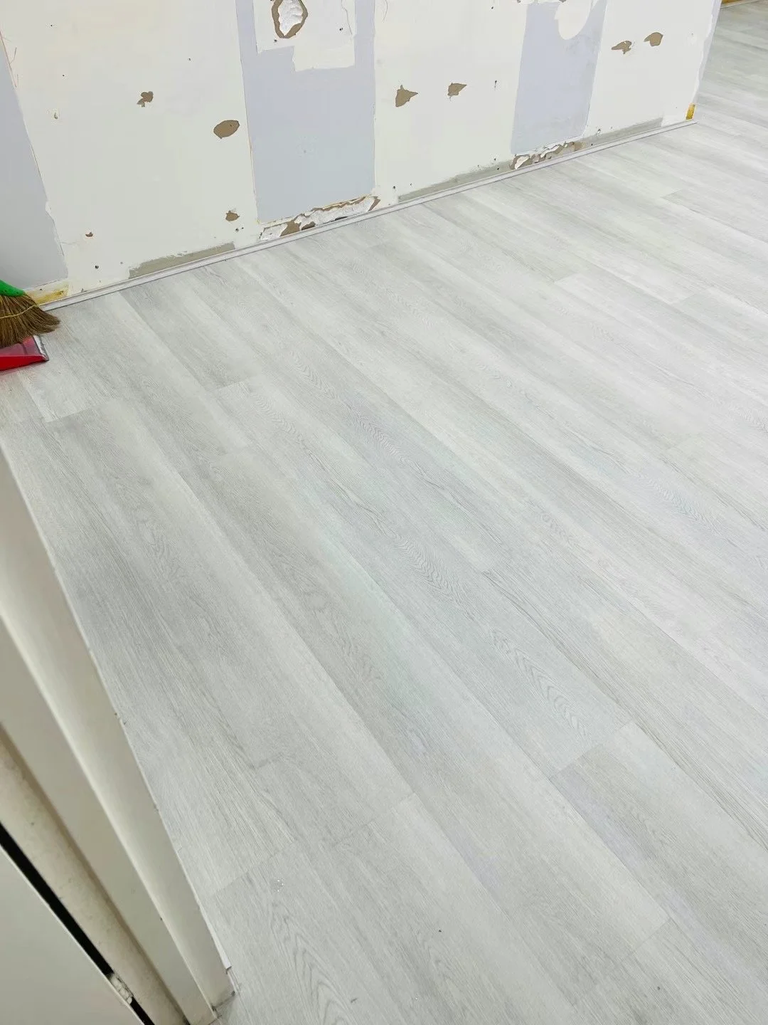 Sample of SPC flooring in a light wood finish, labeled as 'Color: F9703 Wharf'.