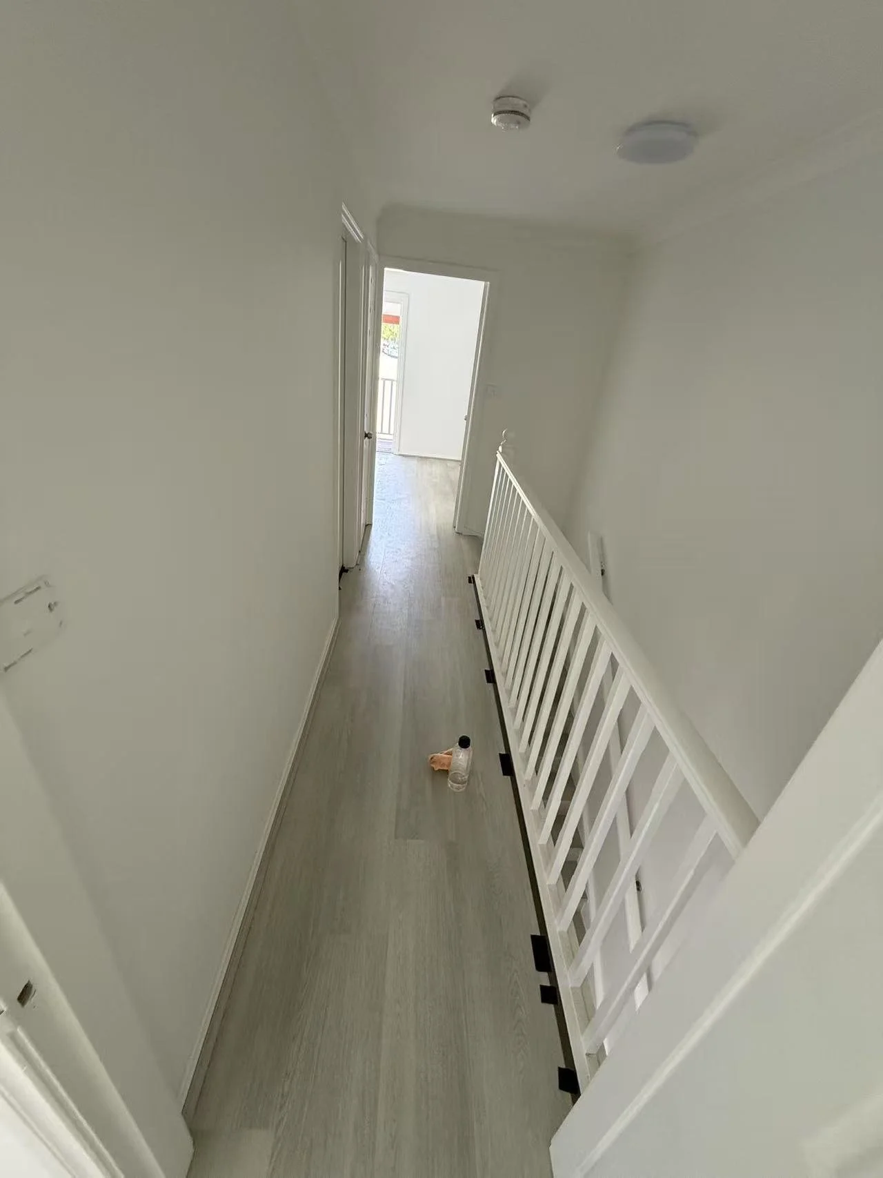 Empty hallway with white walls, a water bottle and cloth on the floor, a white railing on the right, and an open door leading outside in the distance.