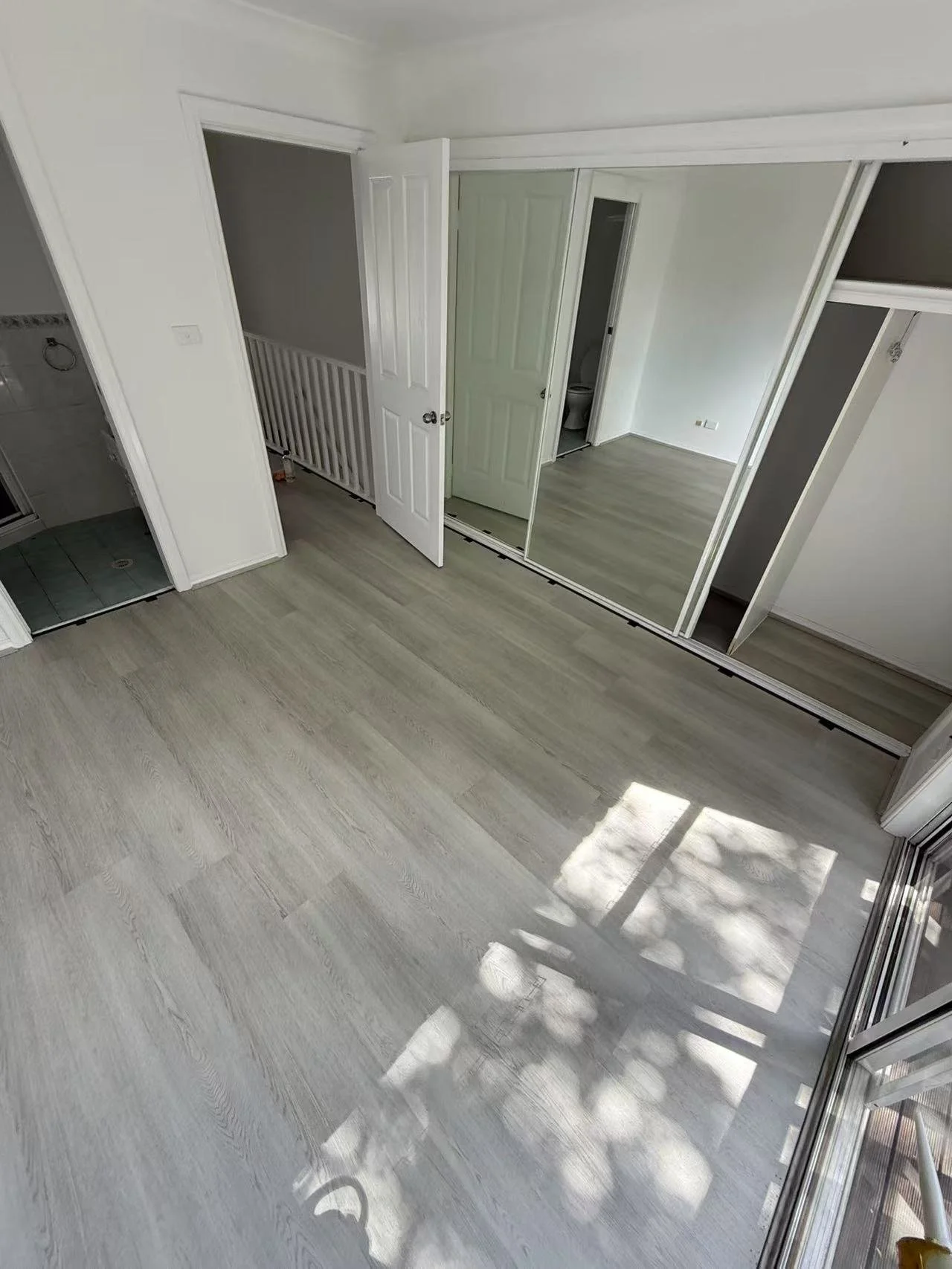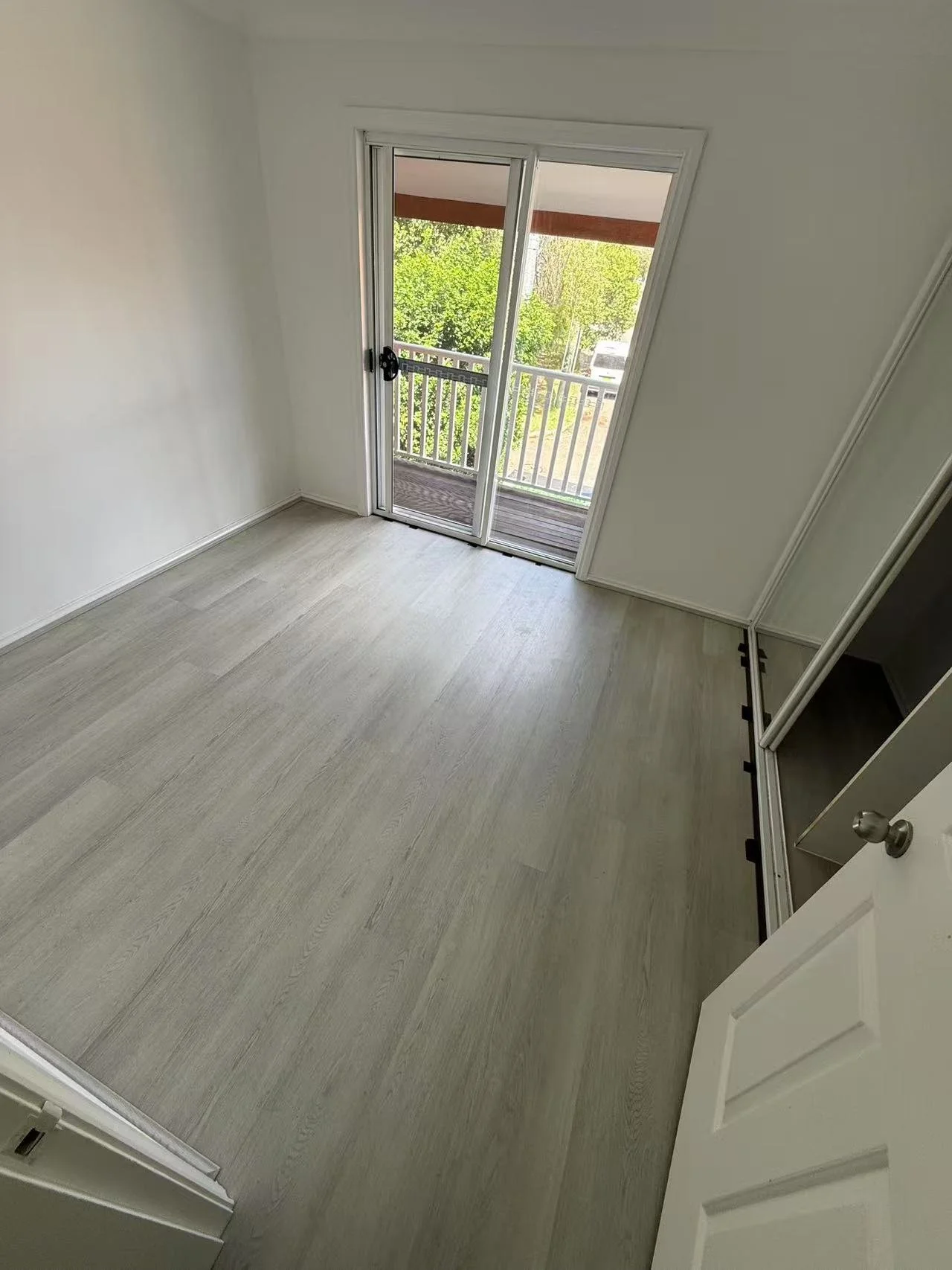 Light gray wood laminate flooring in a room with an open closet in the background.