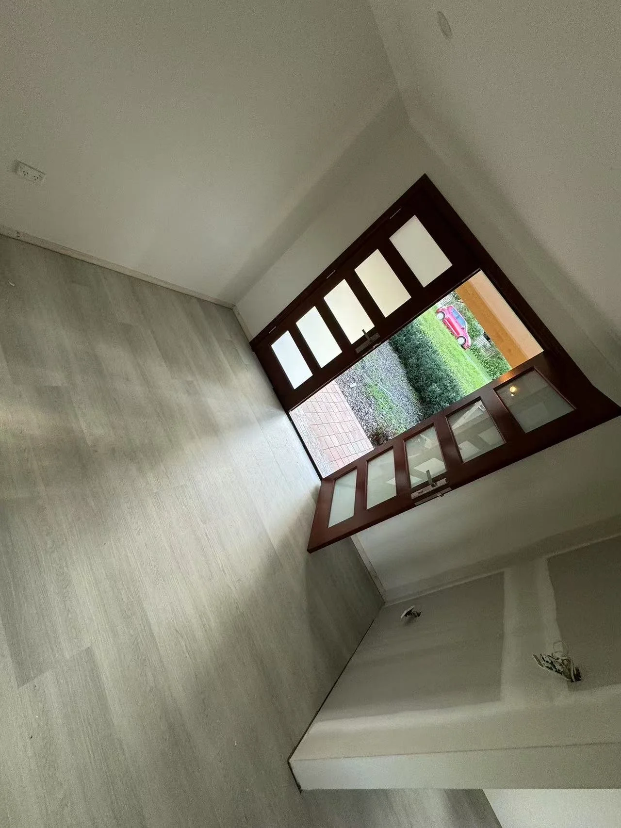 Empty room with wooden floor and open front door leading outside, with a view of a small porch and lawn