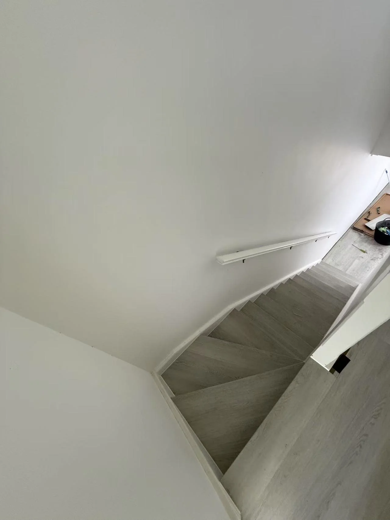 Top view of a staircase with light-colored wooden steps, white walls, and a white handrail along the wall, leading to a lower level with visible part of a floor and some objects.