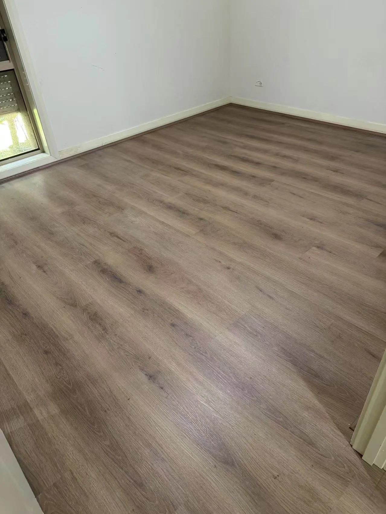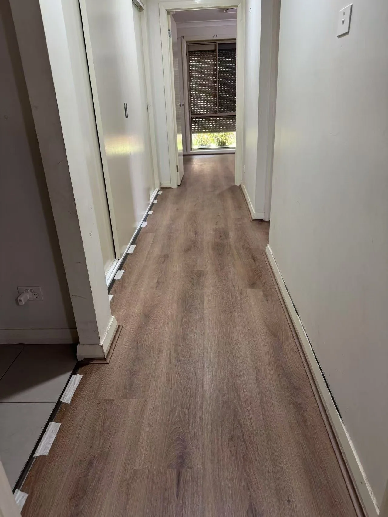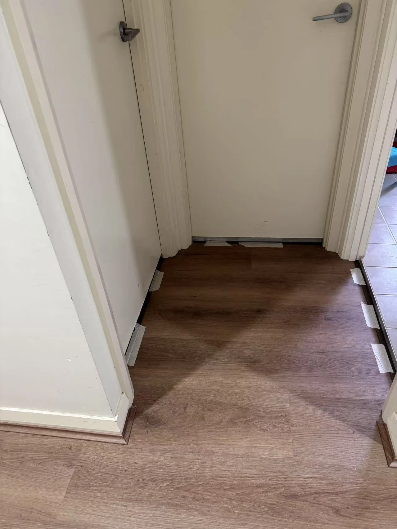 Flooring has been partially replaced with new wood laminate flooring, revealing the subfloor underneath.