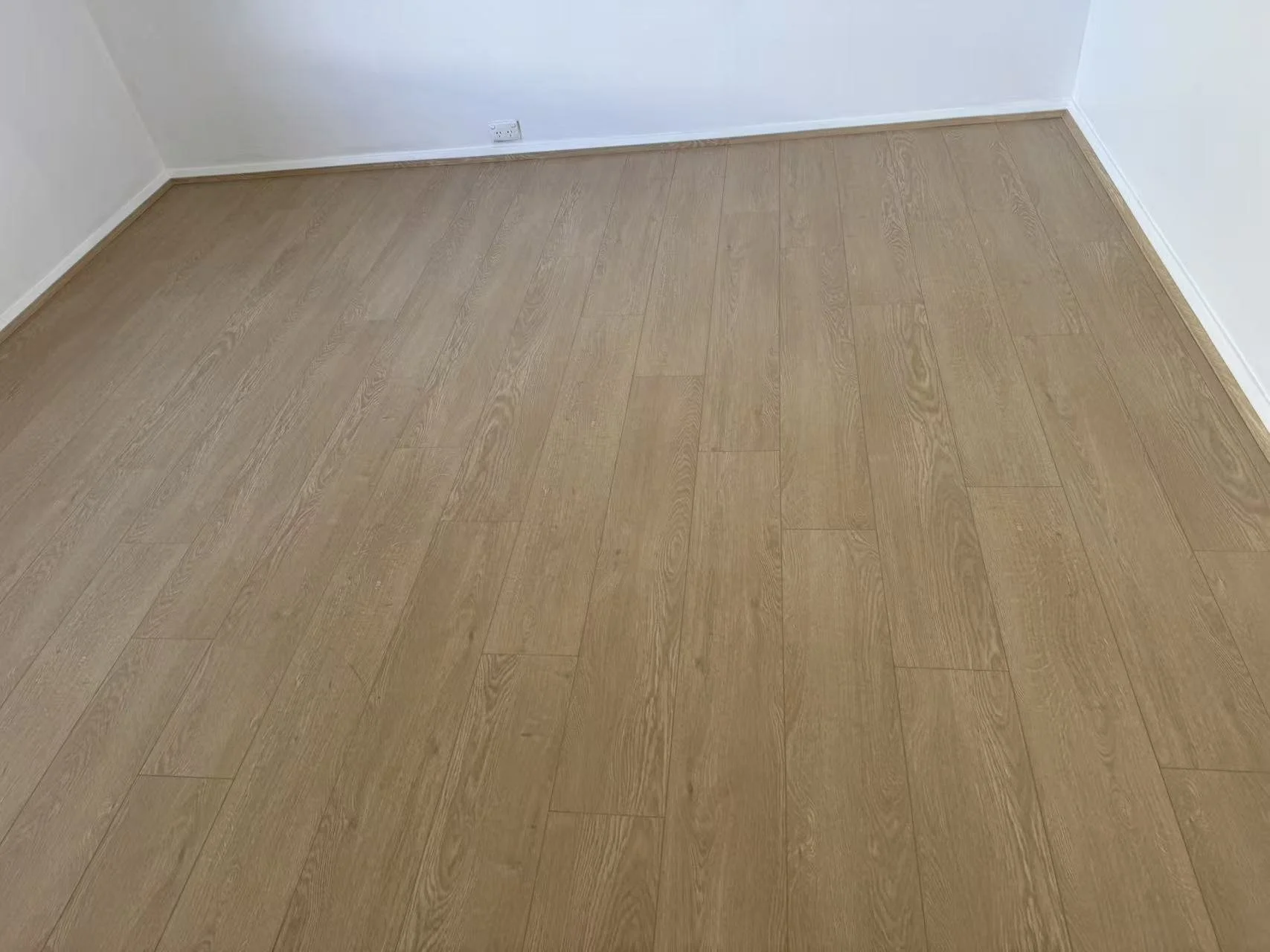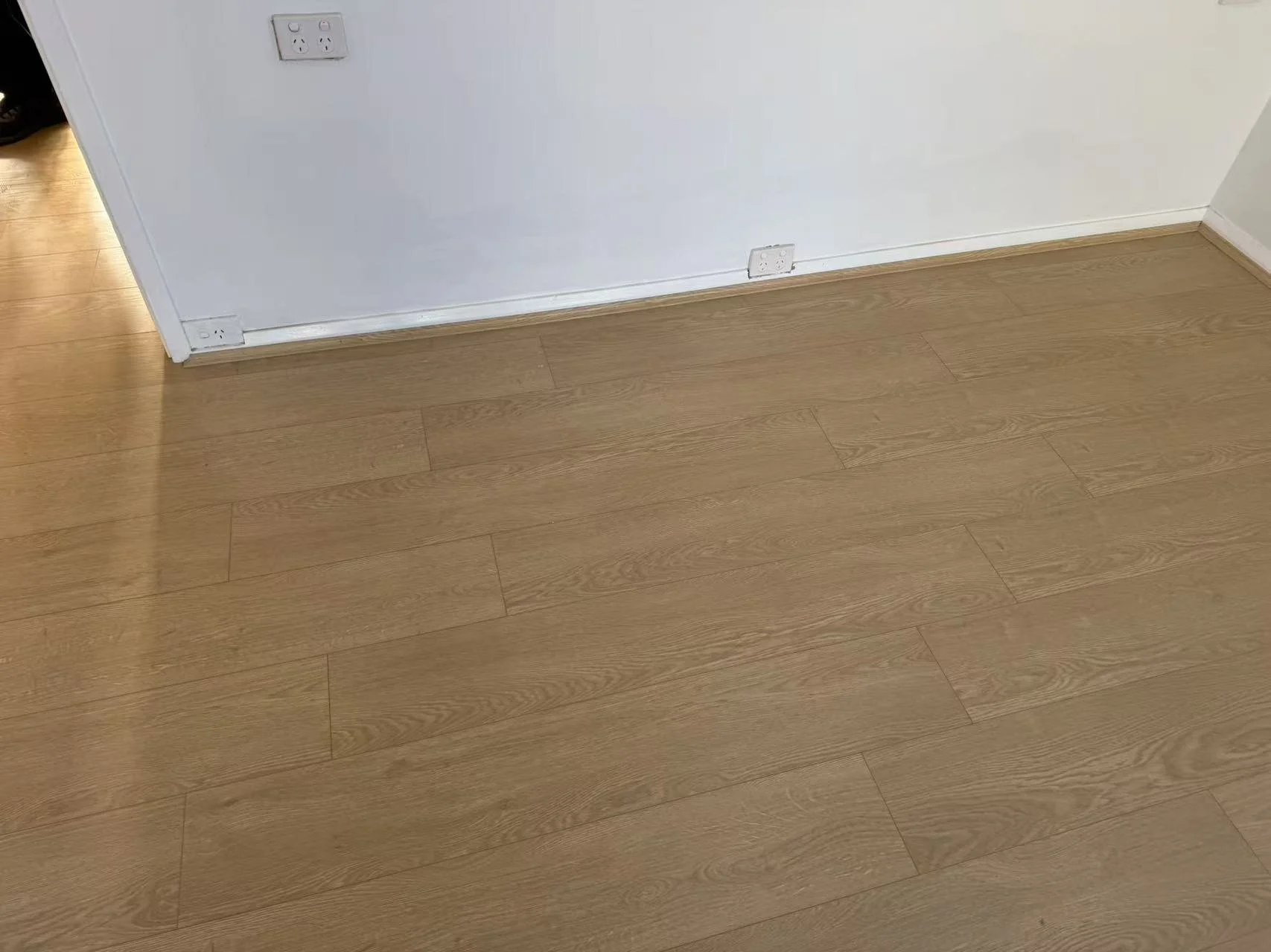 Close-up of a light wood floor next to a white wall with electrical outlets and switches.