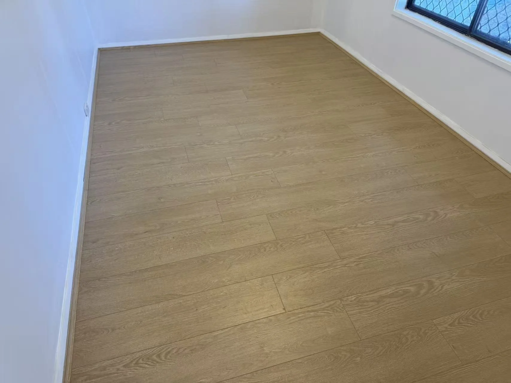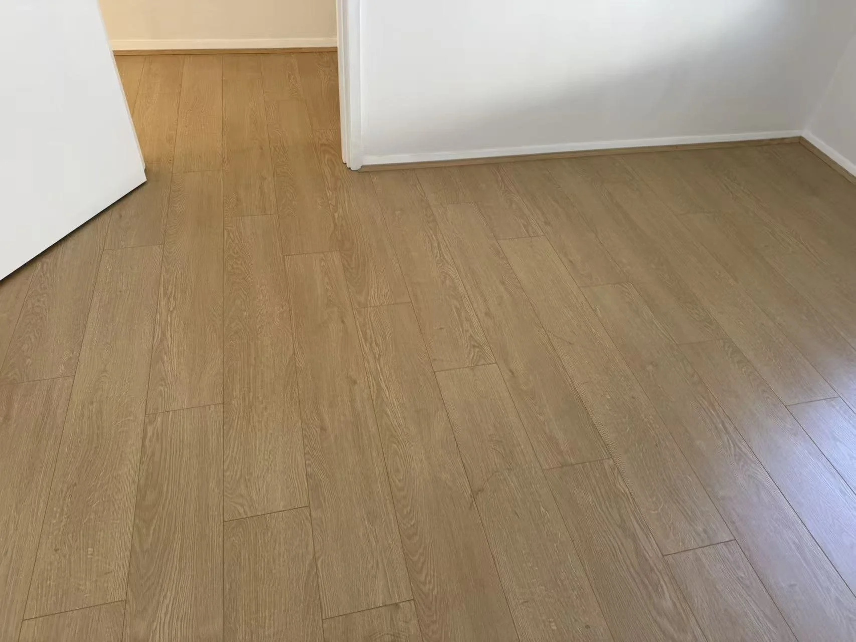 Wooden floor with white baseboards and a white door partially visible.