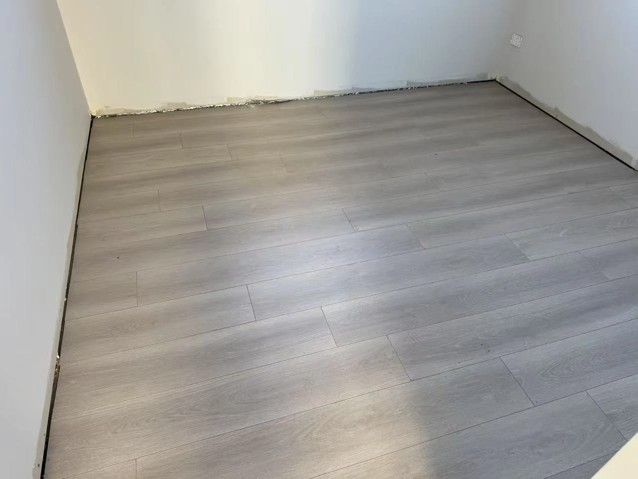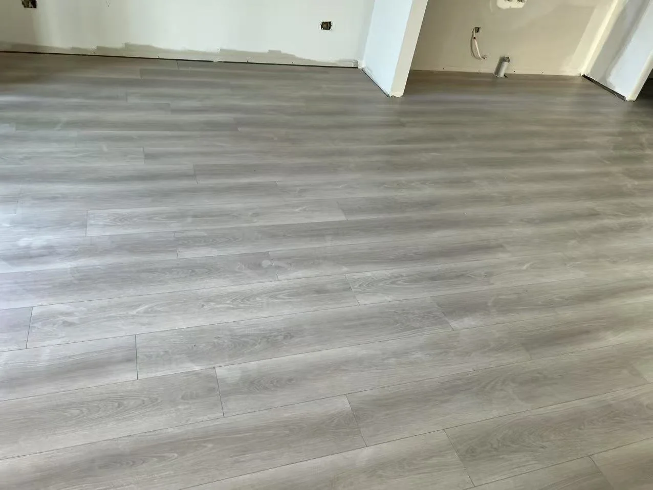 Finished gray wood-look laminate flooring in a room under construction with exposed wall outlets and pipes.