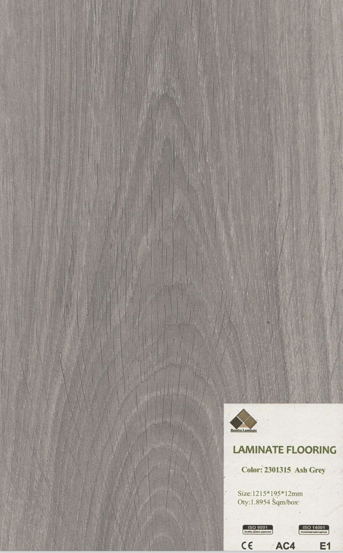 Gray wood laminate flooring sample with a label showing the brand logo, color code 2301315 Ash Grey, dimensions 1215 by 195 millimeters, 12 millimeters thick, and a quantity of 1.8954 square meters per box.