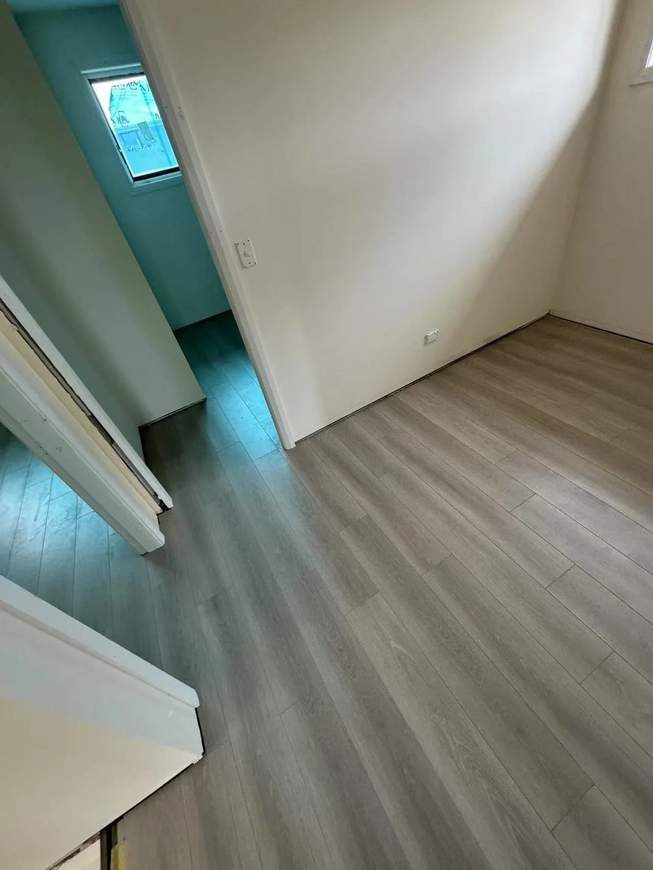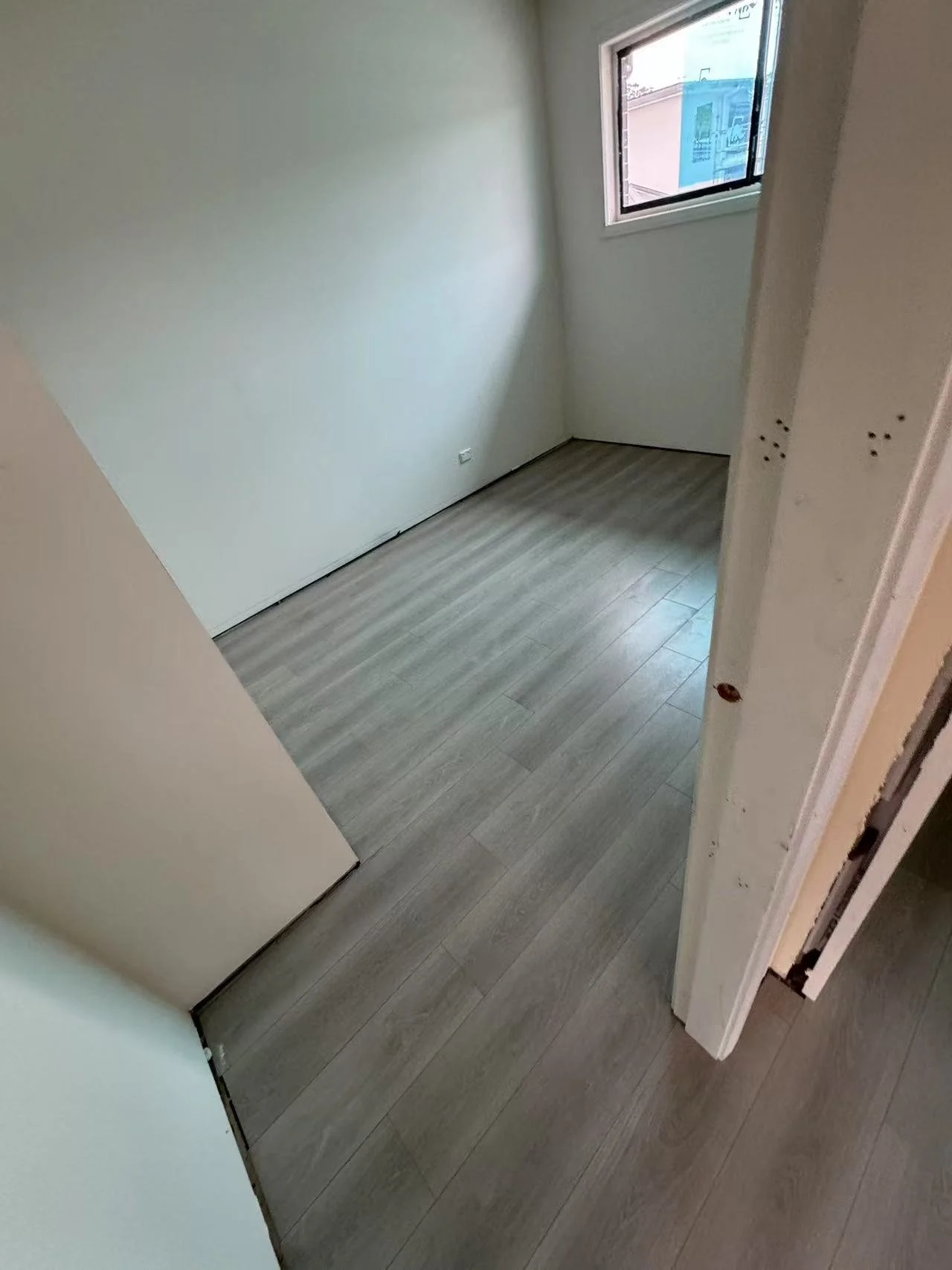 Empty room with light-colored wooden flooring, white walls, and a small window.