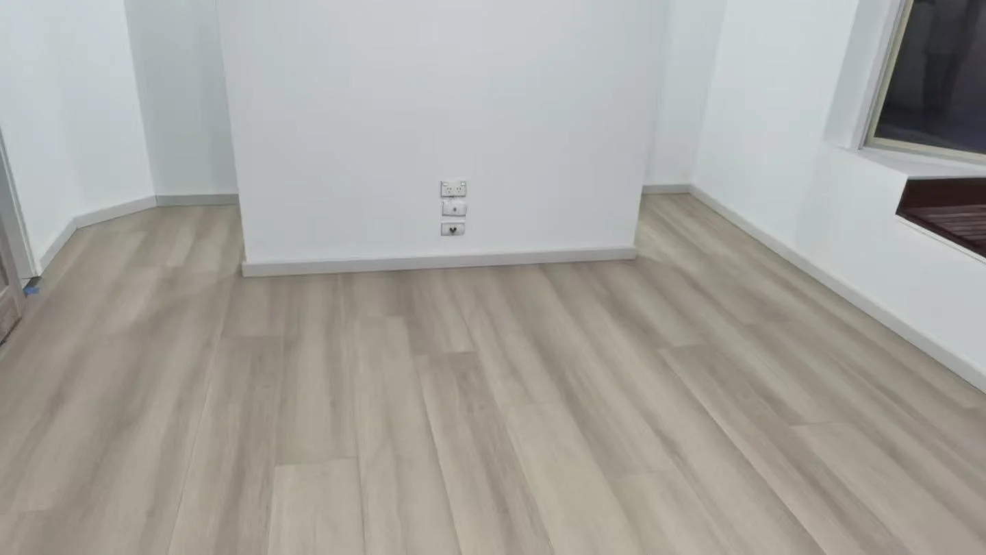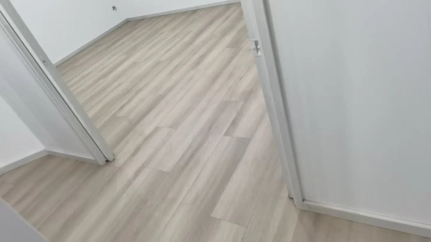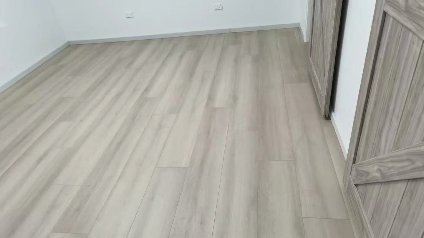 Empty room with light-colored wood floor, white walls, and wooden cabinets.