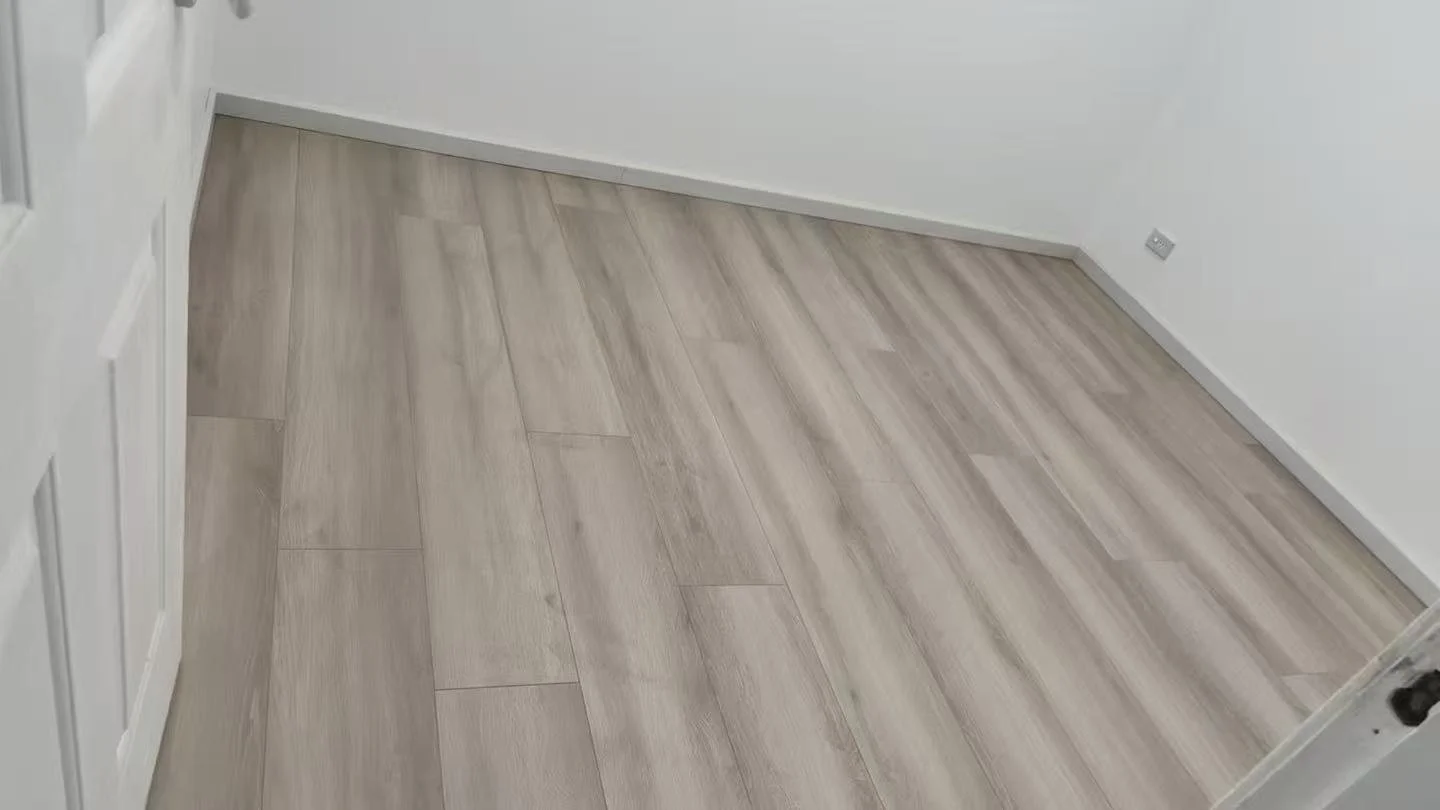 Empty room with white walls, light wood laminate flooring, and a white door on the left.