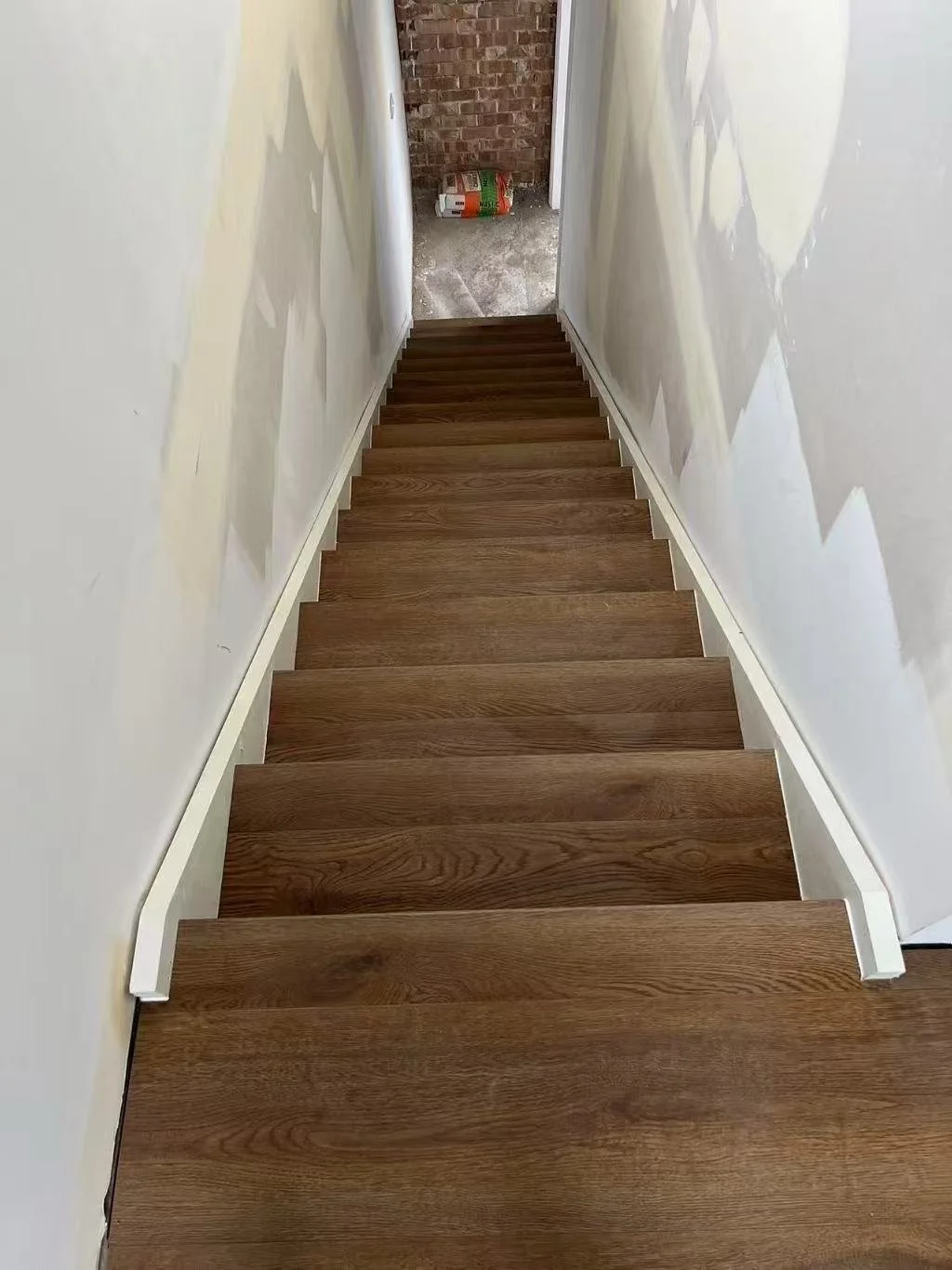 Wooden staircase leading down to a doorway with brick wall and cleaning supplies in the background
