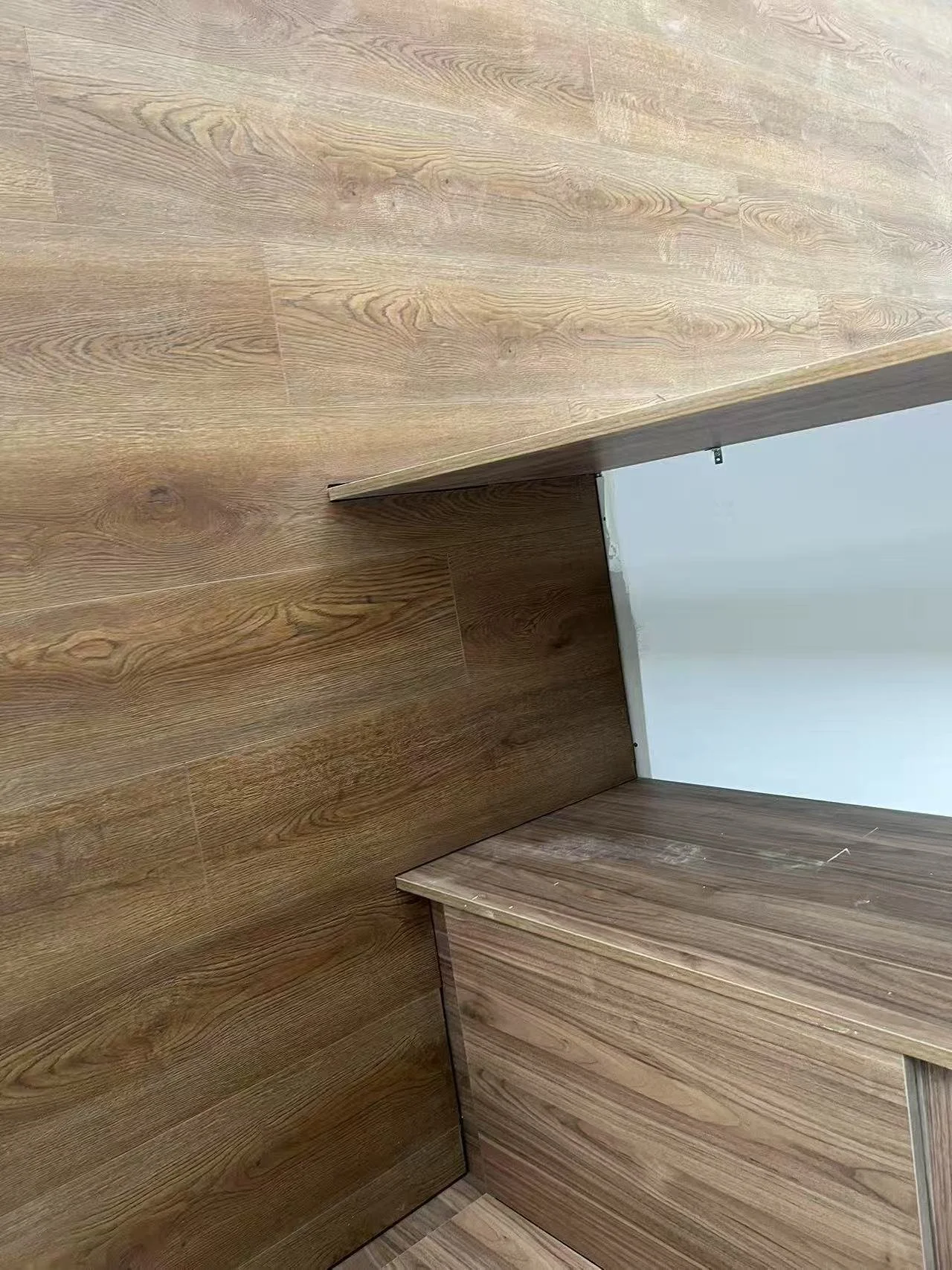 Close-up view of wooden flooring and a corner of a wooden cabinet with a white wall in the background.
