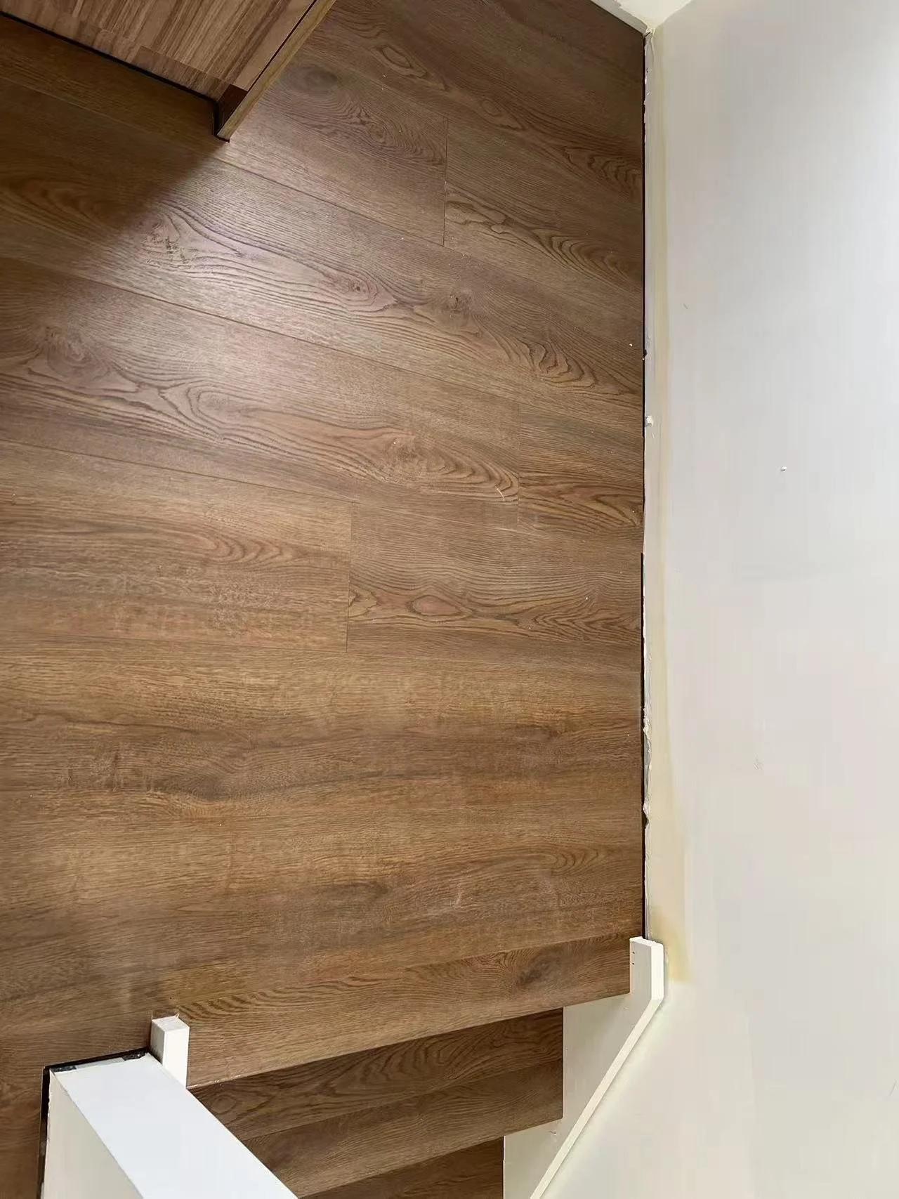 Close-up of a wooden floor with light-colored wall trim on the right, with a small section of a door or cabinet corner visible at the top left.