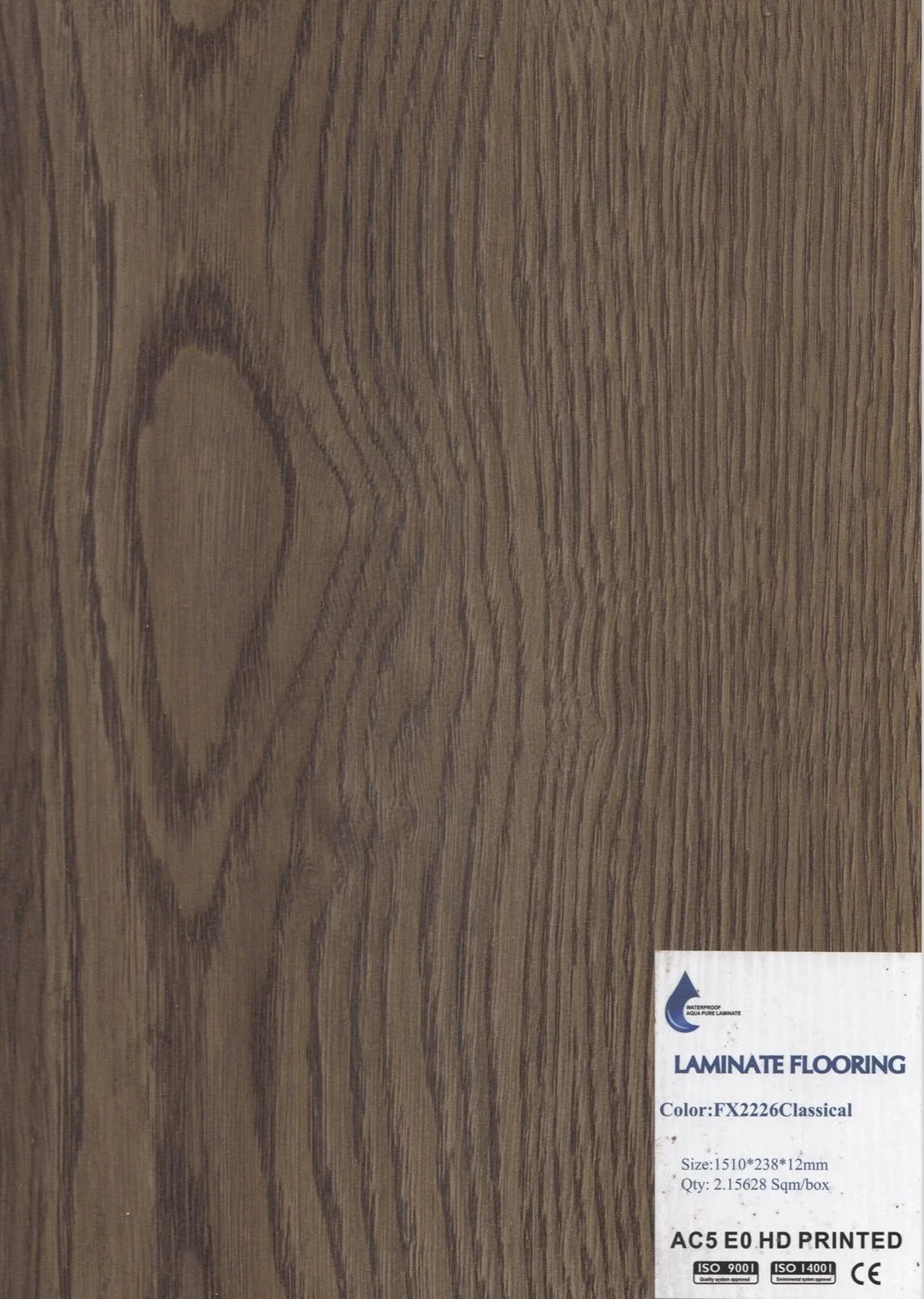 A sheet of laminate flooring with a wood grain pattern in shades of brown, labeled as 'Classic' color FX226.