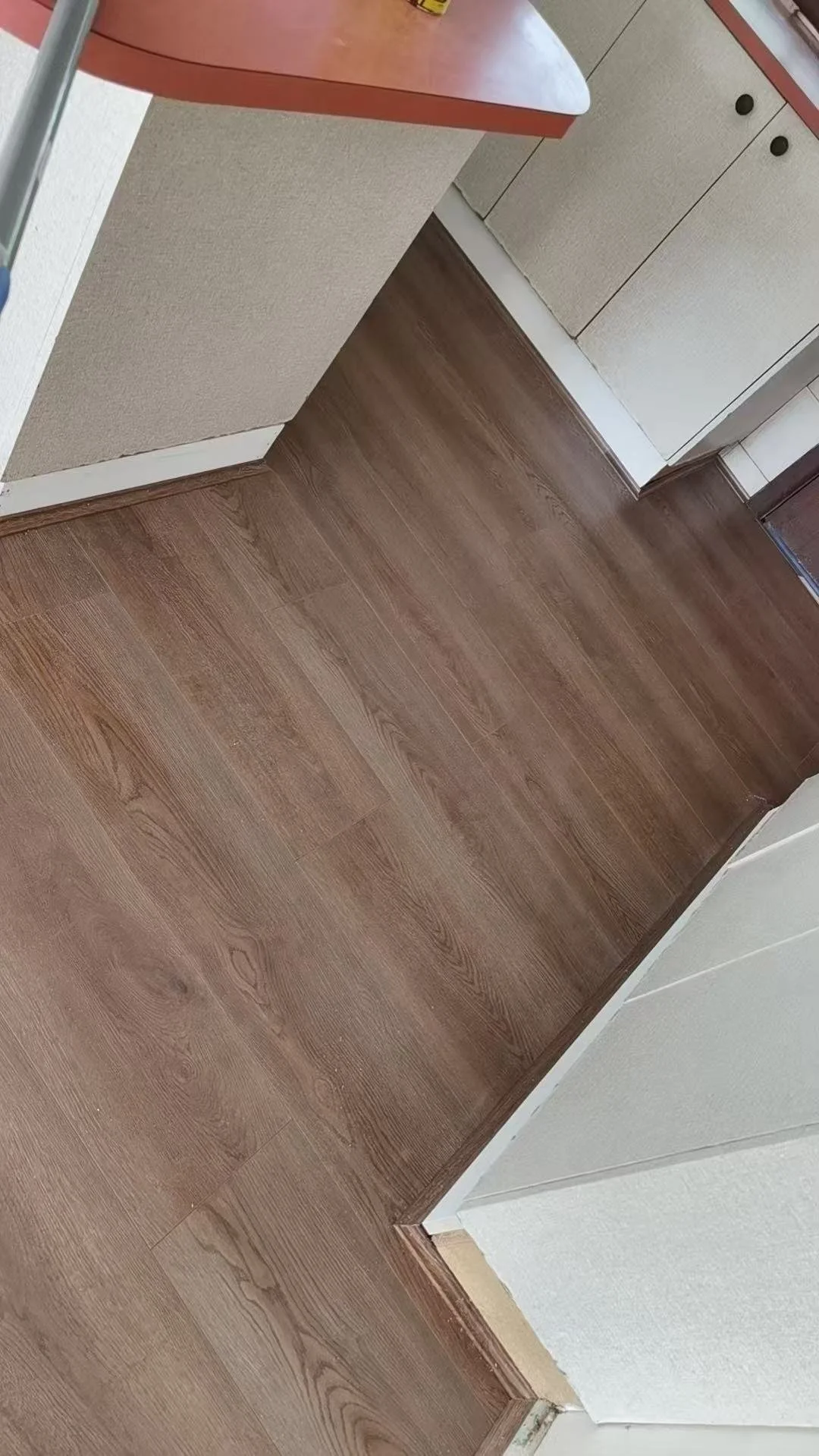 Corner of a room showing wood-look flooring, beige walls, and partial view of a kitchen cabinet and countertop.