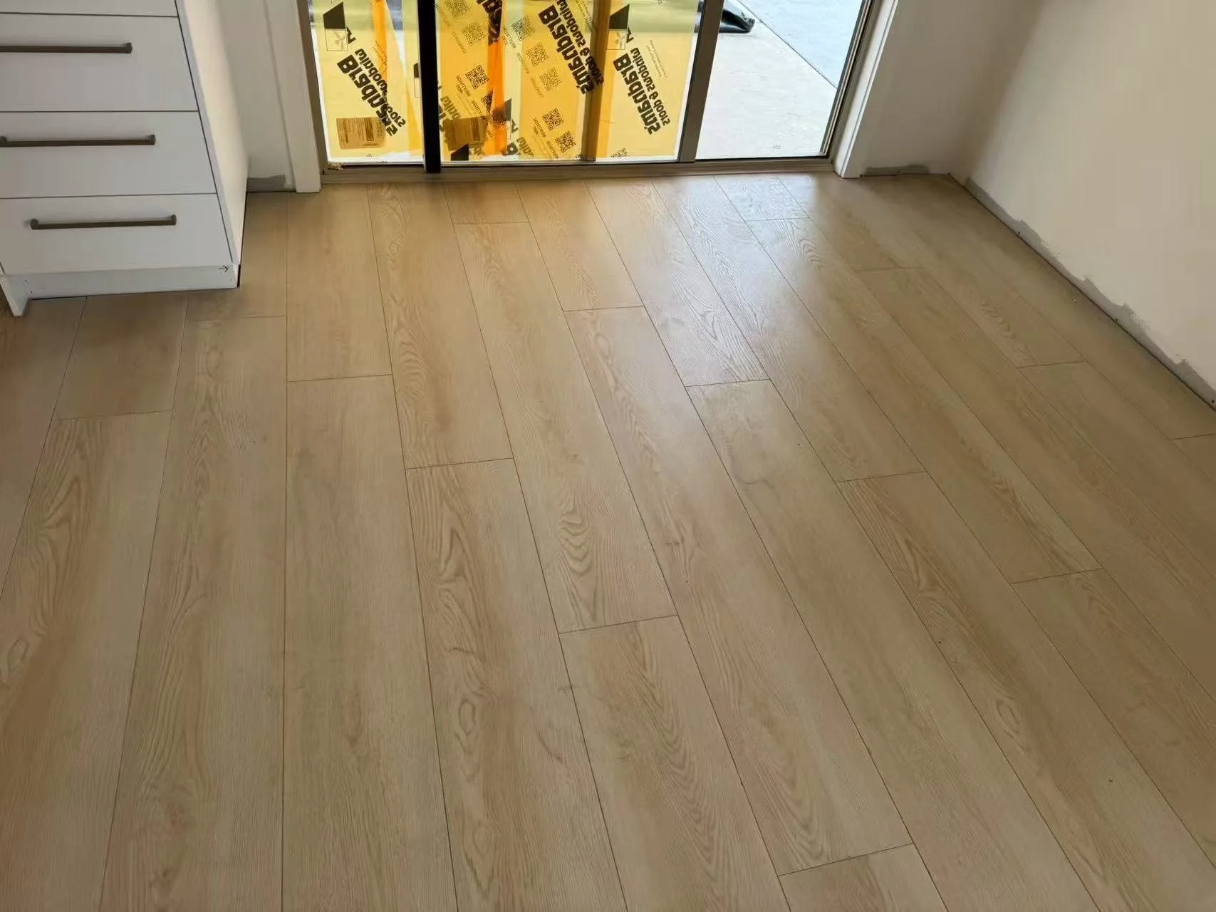 Wooden flooring near a glass door with a black frame, a white cabinet with three drawers on the left, and construction insulation visible outside through the door.