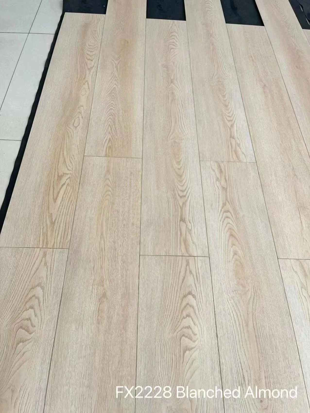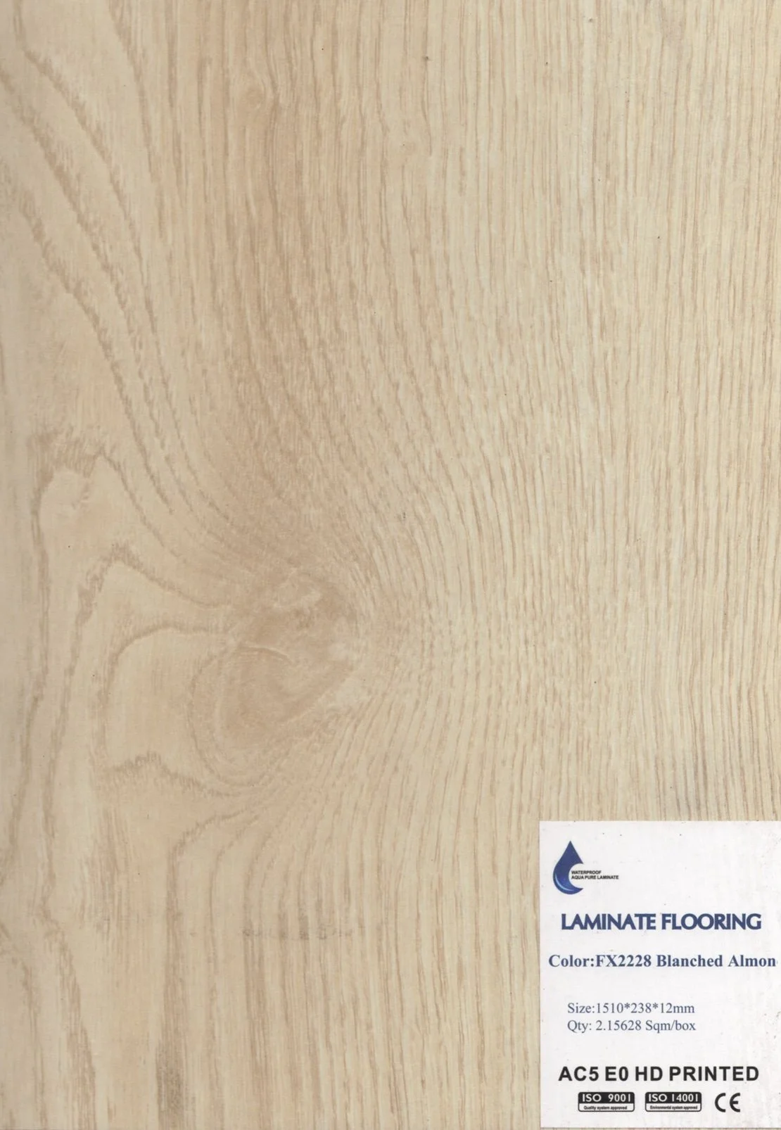 Sample of laminate flooring with a wood grain pattern and a label indicating color FX2228 Blanched Almond.