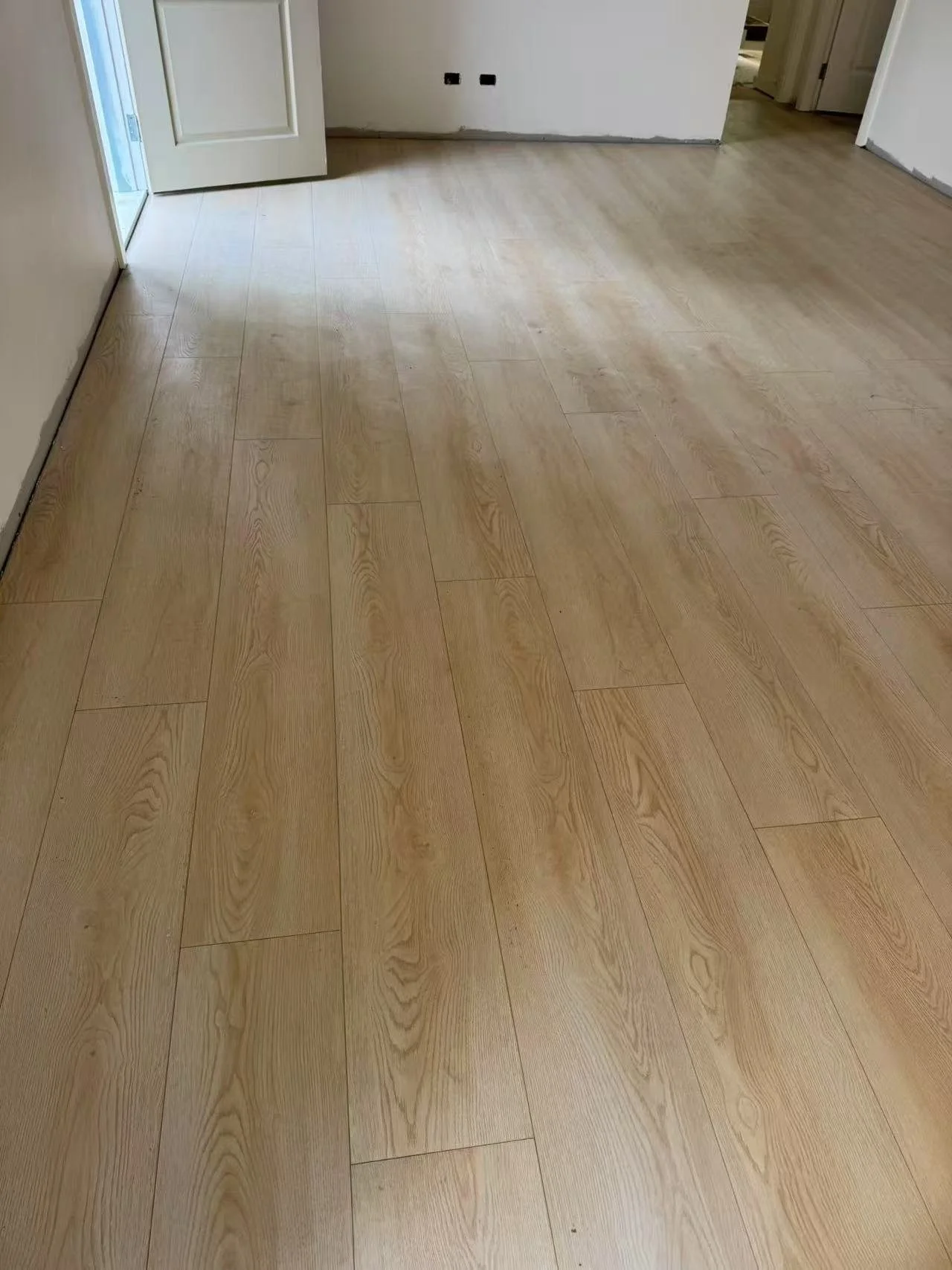 Empty room with newly installed light wood flooring, some wall outlets visible, and a partially open door leading outside.