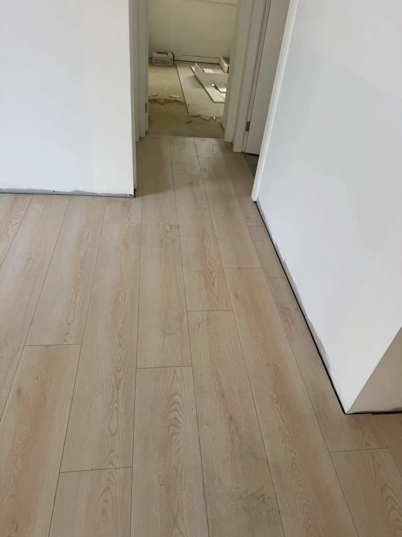 Light-colored hardwood flooring in a hallway leading to a room with interior debris and building materials.